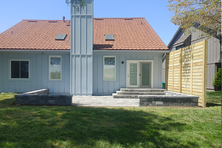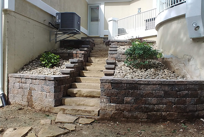 A crumbling deck and wooden staircase were removed, and replaced with longer-lasting natural stone stairs and retaining walls. This design also allowed for plantings to enhance the area.